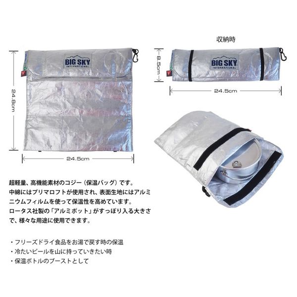 ・フリーズドライ食品をお湯で戻す時の保温用コジーとして ・冷たいビールを山に持っていきたい時の保冷バッグとして ・保温ボトルのブーストとして サイズ:25cm x 25cm 重量:46g