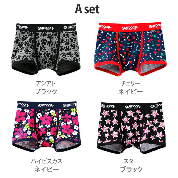 ブランド: OUTDOOR PRODUCTS デザイン: アシアト(前閉じ) チェリー(前閉じ) カラフルスター(前閉じ) ハイビスカス(前閉じ) カラー : Aセット / Bセット サイズ : メンズ M (ウエスト76〜84cm) メンズ L (ウエスト84〜94cm) ※ カラーは2パターンの組み合わせ(A/B)からお選びいただけます。